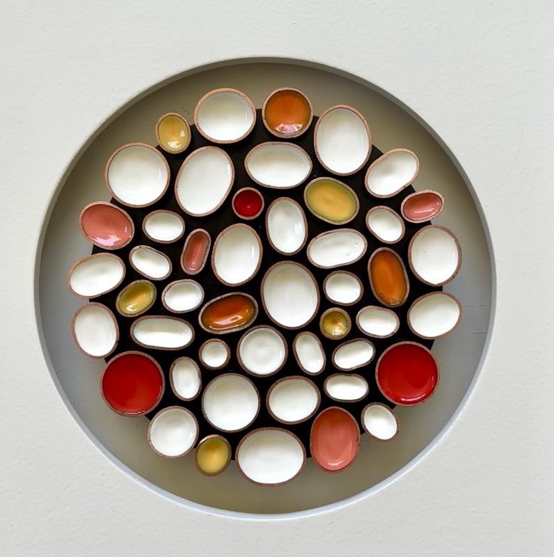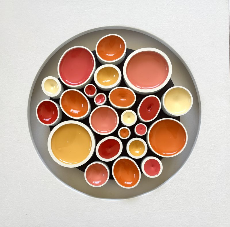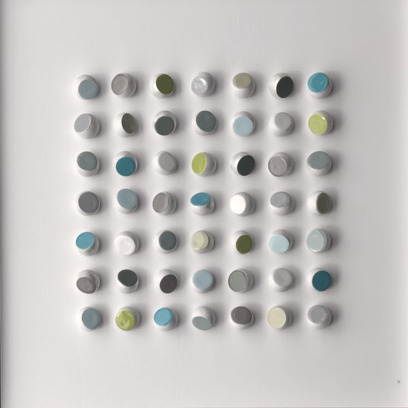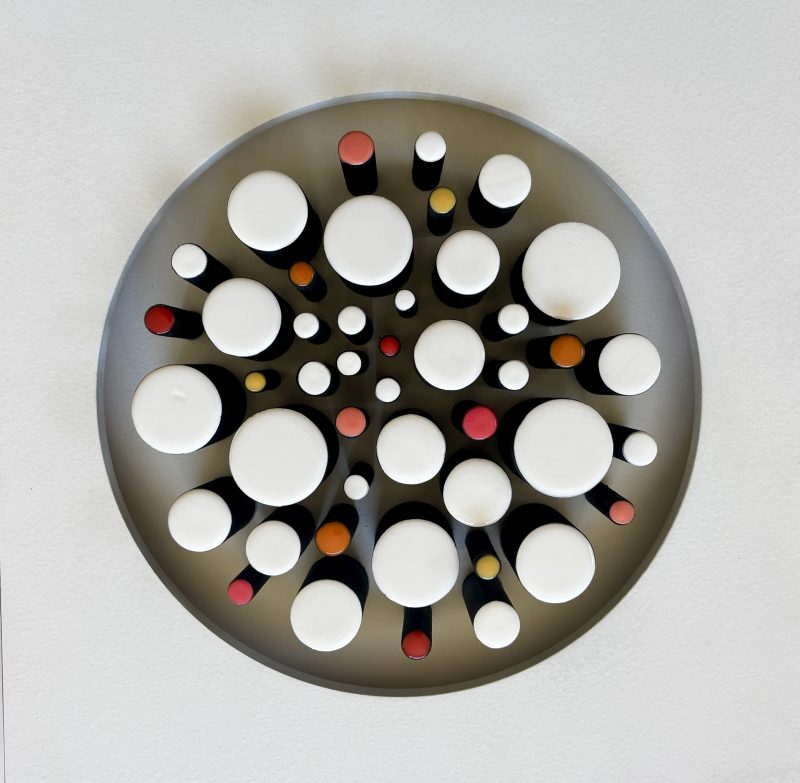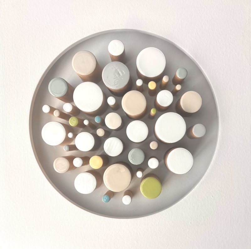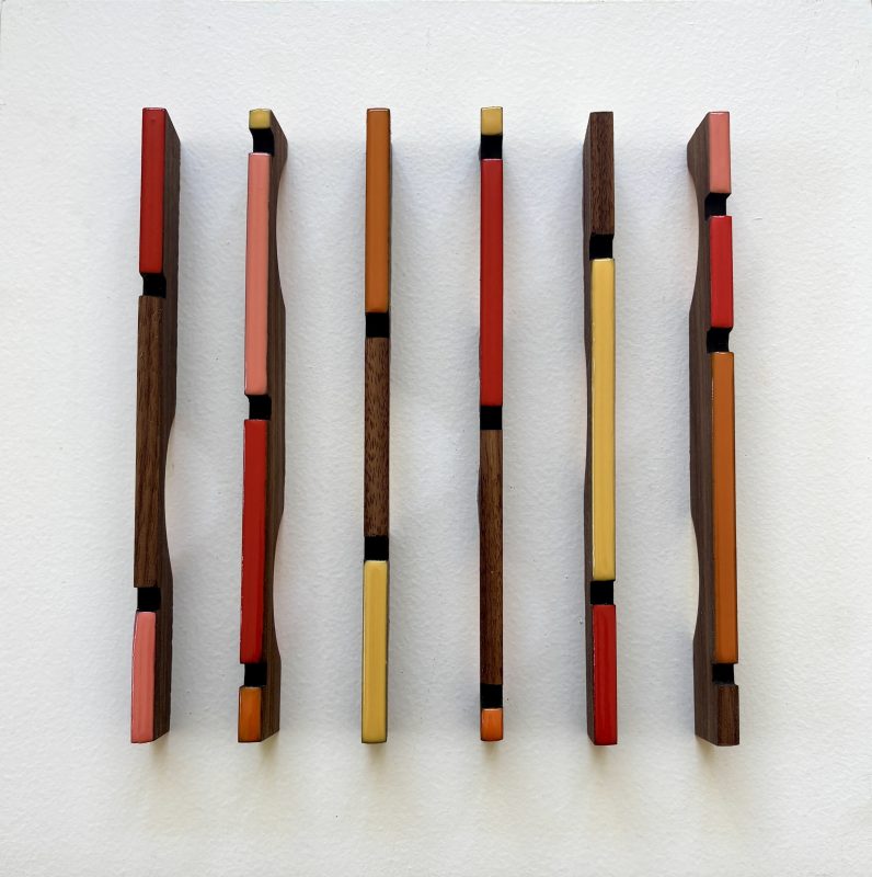 At once graphic and sculptural, Richelle’s work plays with shape, colour, texture, light and shadow to create engaging, one-of-a-kind art pieces. Inspired by colour-blocking and geometric design, it thrives on the use of everyday materials, from hardwoods and copper rings to rubber and plastic tubing.
