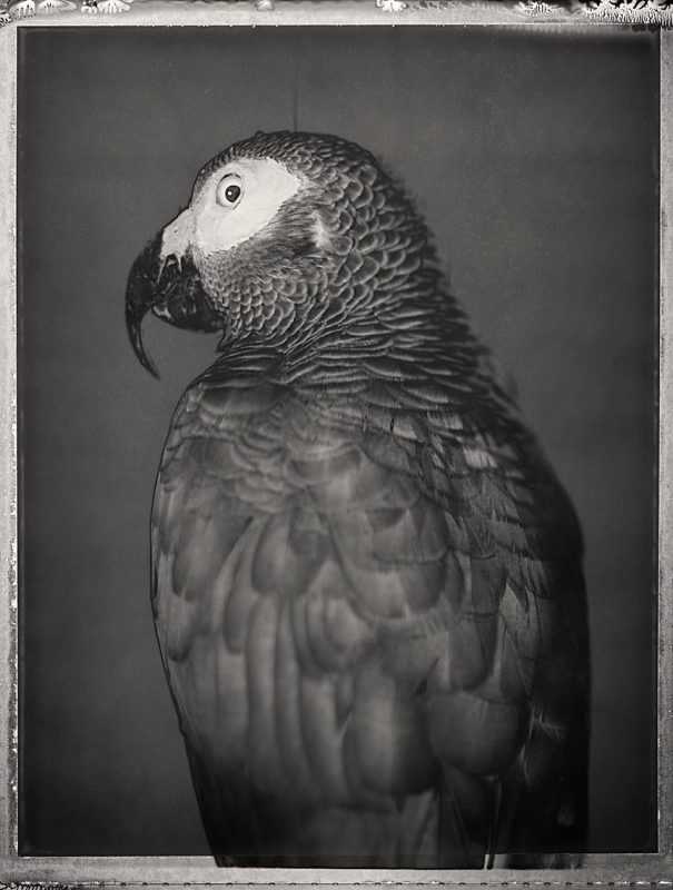 African Grey Parrot, Psittacus erithacus – Pigment ink on cotton rag from solarized Polaroid 55PN film negative 17″x13″ Framed to 25″x20″ Edition of 5 by David Ellingsen. Price $950