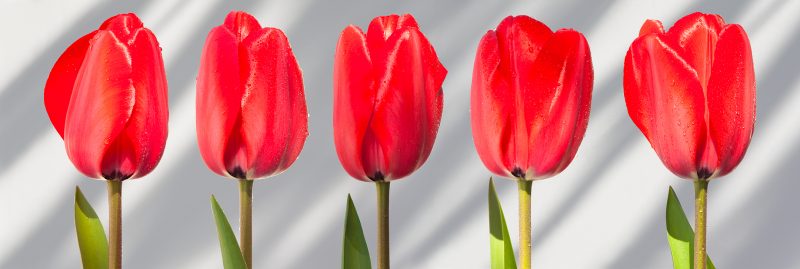 Previous Image Next Image Five Red Tulips Five Red Tulips – Limited Edition: 2/12, 20”x60”, Photograph (flush mounted on aluminum) by Gillean Proctor. $3600