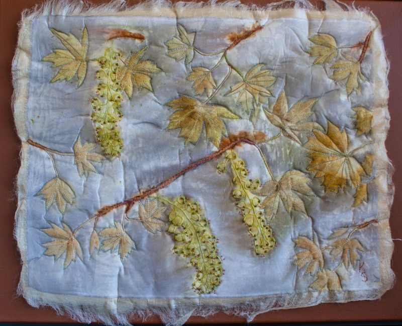 Spring Maple – Print Made with Plant Material and Natural Dyes on Silk. Enhanced with Machine and Hand Stitch as well as Beads 15″ x 19″ $650