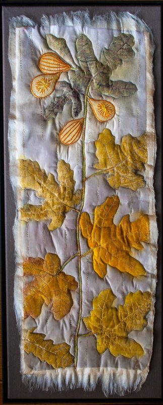 Summer’s Nectar – Print Made with Plant Material and Natural Dyes on Silk. Enhanced with Machine and Hand Stitch 13″ x 31″ $850